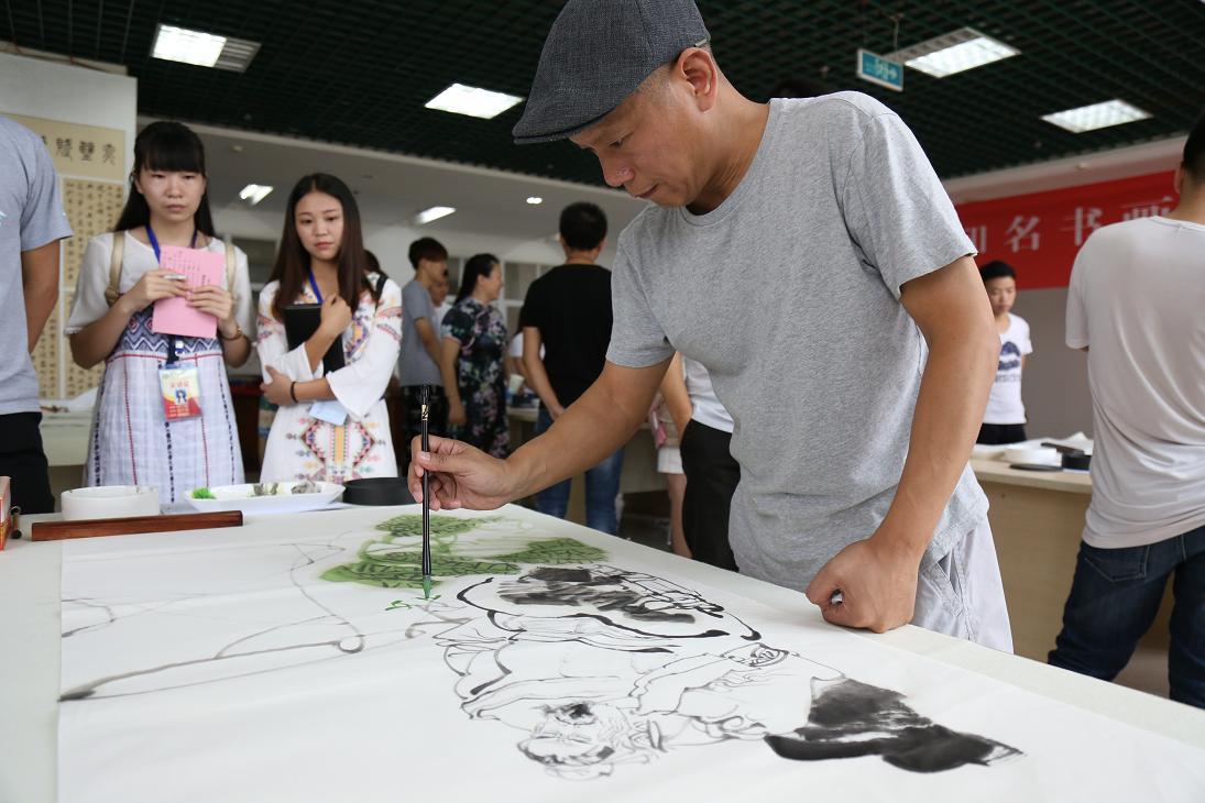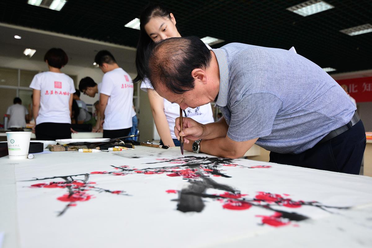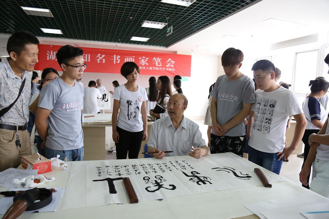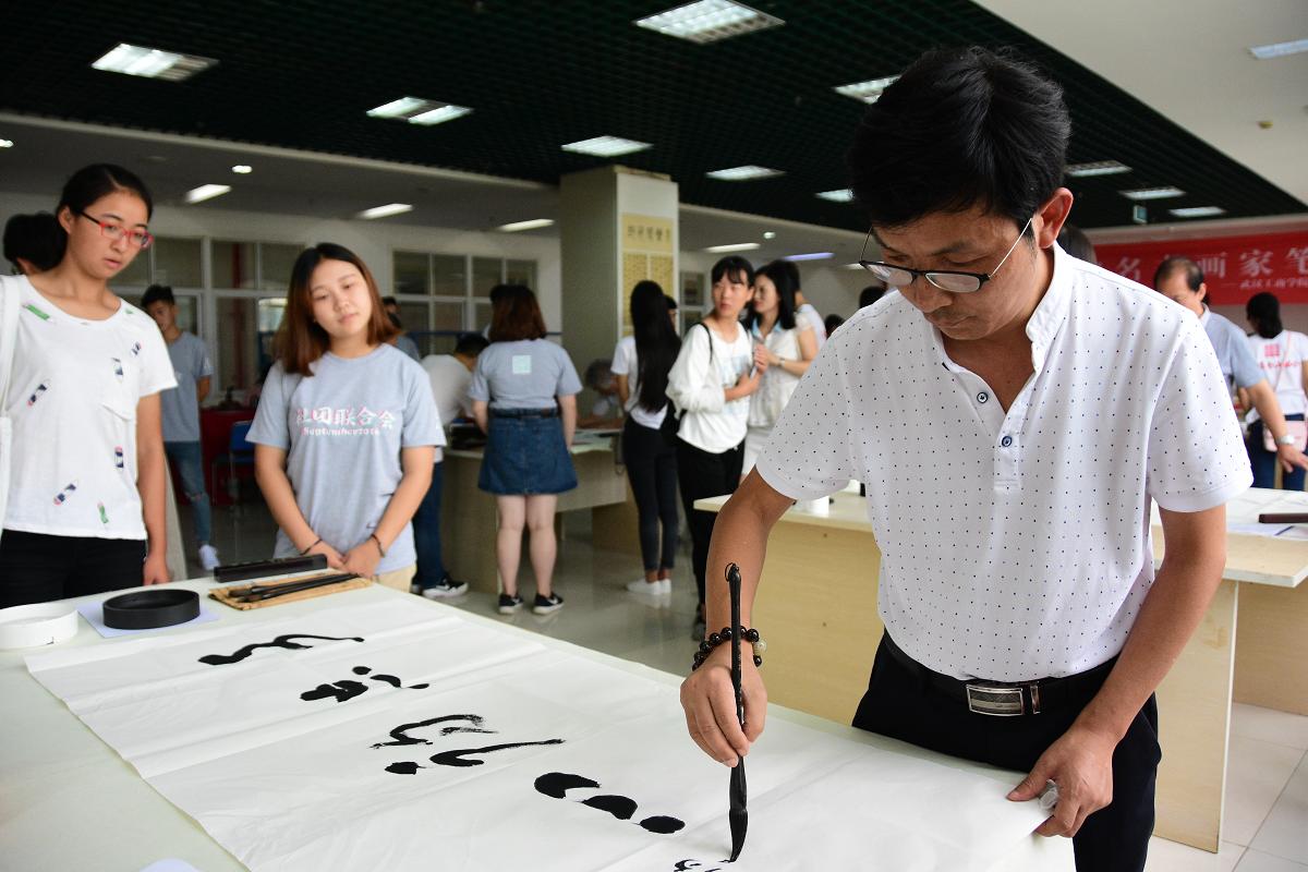 新闻中心讯(记者蓝静容书慧 摄影 王晨杲 熊名扬)9月10日上午,武汉工商学院图书馆艺术与外文文献阅览室内翰墨飘香,湖北知名书画家刘友凡、叶军、彭新峰、张健、陶梅生,知名书法家张冰梅、王海涛、张尤、王泉在此参加该校逸墨书画协会主办的“传承传统文化,品味书画魅力”主题笔会活动。书画家们挥毫泼墨,笔走游龙,创作出一幅幅精美的书画作品,30多名该校书画协会会员和书画爱好者们现场观摩学习,现场气氛十分热烈。