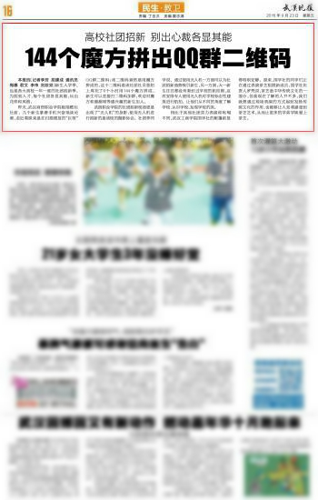 昨天,武汉商贸职业学院极限酷玩社前,几个新生拿着手机兴奋地谈论着,走近看原来是在扫描摆放的“巨型”QQ群二维码;该二维码竟然是用魔方拼成的。这个二维码是该社团社员张阳上周花了6个小时用144个魔方拼成,新生可以直接扫二维码加群,欢迎对魔方和溜溜球等感兴趣的新生加入。