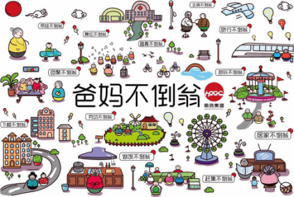 “《爸妈不倒翁》能够在众多平面广告作品中脱颖而出是因为作者将常人思维里对老年人固有的思维模式和行为方式摒弃,在画面中对老人的生活状态进行卡通处理,并将流行的扁平化风格接入画面,制造出消费盖中盖产品也是一种时尚的氛围。”何兴萍的指导老师何轩介绍道。