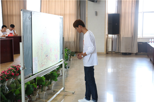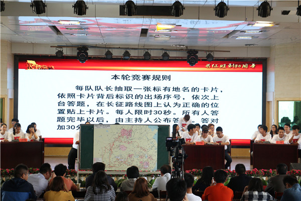 第一轮是长征知识图填充,10支代表队各派1名选手抽签,所抽到的标签后面标有地名或事件,要求与路线图上的图标相对应。每位选手各有30秒的思考时间。只见台上的选手们有的自信满满,有的犹豫不决,台下鸦雀无声,更增添了一丝紧张的气氛。第二轮是必答题,采取笔试的形式,选手需在5分钟的时间内完成20个单选题,答题完后评委现场改分。