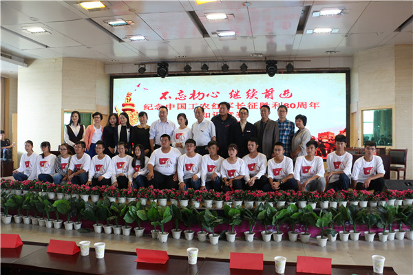 陈伟书记致辞。他讲到,红军长征是波澜壮阔的革命史,是中国革命力量新的聚合。对于长征胜利80周年纪念活动,学校高度重视,为此策划组织了一系列以“长征”为主题的活动,包括“看长征电影”、“讲长征故事”、“赛长征知识”、“唱长征歌曲”、“重走长征路”等。随后他还阐发了长征精神的内涵:坚定的信仰、必胜的信心、大无畏的精神、坚强的意志,并期望大家把长征精神运用到中国特色社会主义现代化建设和学校当下正在开展的迎评工作中。