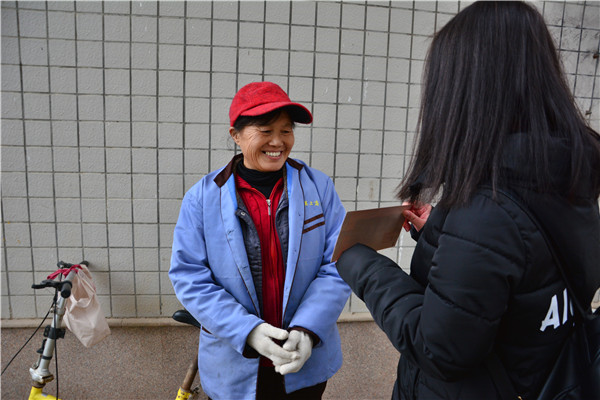 54岁的陈冬梅是该校4栋宿舍楼的宿管阿姨,她收到同学们的感谢信后脸上笑开了花,连声说:“谢谢!”“谢谢!”