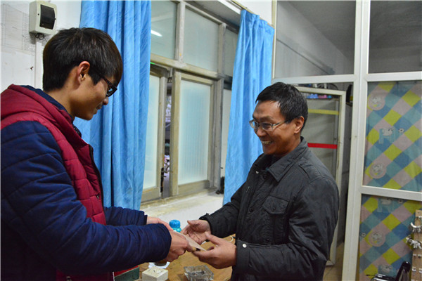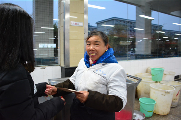 图为同学们将感谢信送到后勤人员的手中 摄影:哈庆玲