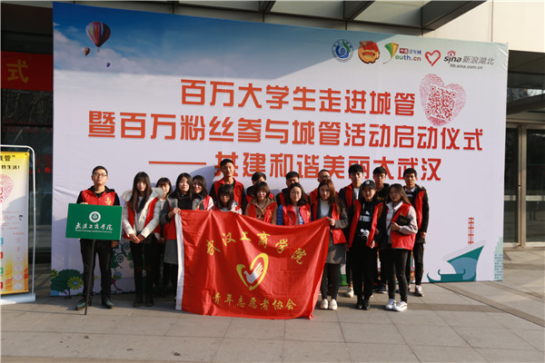 新闻中心讯(记者洪苗苗)2.26日上午9:30,“百万大学生走进城管”暨“百万粉丝参与城管”活动启动仪式在洪山区隆重举行。活动现场,来自全市30多所高校的500多名大学生志愿者参加了仪式。武汉工商学院青年志愿者协会的20名志愿者在该校团委副书记邱玉添的带领下参与了本次活动,他们将走上街头,体验城管工作的酸甜苦辣。