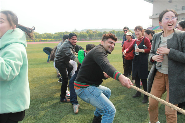 图为武汉工商学院留学生们正在拔河 摄影:荣艺