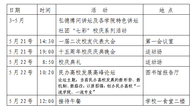 同时,学校在5月期间将举行杰出校友评选、优秀校友经验交流会、十五周年征文、演讲比赛等庆祝活动,以及大学生艺术节、社团“七彩”活动等系列文艺演出;各学院也将举行相关庆祝活动。我们热切期待广大校友重返母校,参加校庆庆典各项活动,畅叙师生之情、同窗之谊;我们诚挚邀请四海宾朋莅临我校,同庆盛典,齐商未来。