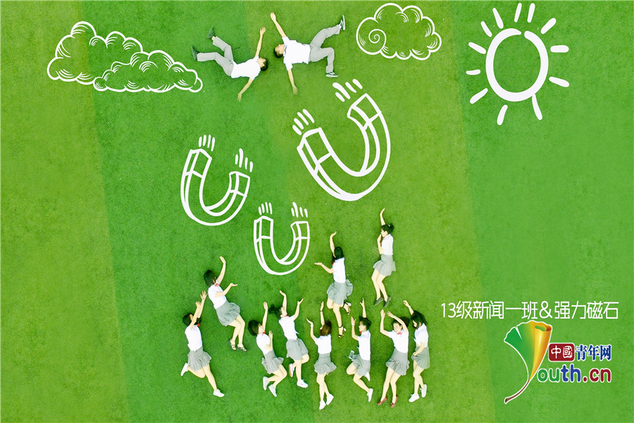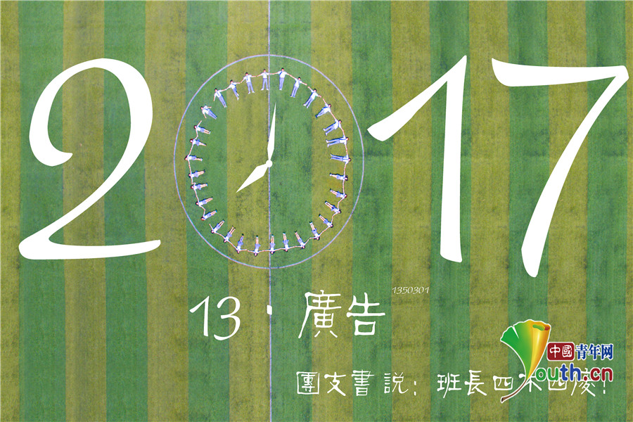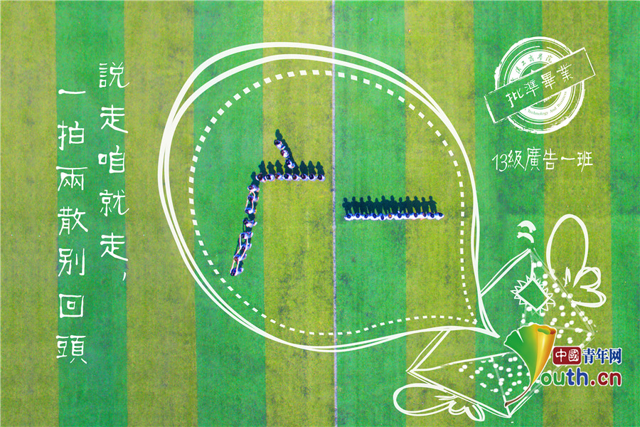 中国青年网武汉5月27日电(洪苗苗 罗袁璐)以绿茵地足球场为背景,用航拍器做眼睛。近日,武汉工商学院2013级广告专业1班和新闻专业1班的航拍的“高大上”又“小清新”风格的毕业照刷爆了朋友圈。照片中全班同学统一服装摆出“蒲公英”“时钟”“灯泡”“2017”等设计好的各种造型,配上“毕业了,终于和你穿了一次情侣装”“学新闻的女孩子,宇宙无敌女汉子”等创意无限的文字和图画,让人直呼有创意。