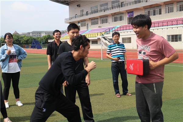 新闻中心讯(记者 王依林)“出拳快如闪电,在很短距离就能瞬间击倒对手,这是咏春拳这一中华民族传统武术的重要特点。”6月6日上午9:00,在武汉工商学院操场上,该校咏春社的社长秦俊杰一边向前来该校访问交流的泰国学生示范咏春拳的拳法,一边耐心地讲解咏春拳的要领。