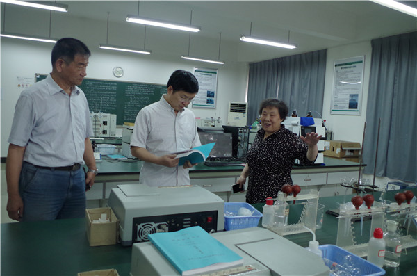 张新祥教授(右二)在夏再兴教授(左三)、张俊(左二)和颜爱国副主任(右一)的陪同下参观实验教学中心