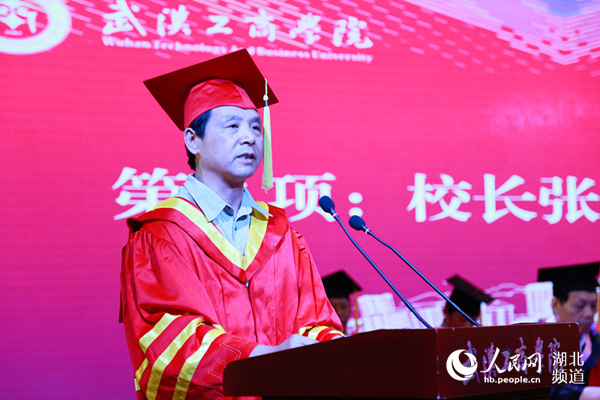 人民网武汉6月20日电 昨日,在武汉工商学院2017届学生毕业典礼暨学士学位授予仪式上,该校校长张金隆教授短短8分钟的毕业典礼致辞,被学生报以多次掌声,表达了对校长演讲的共鸣和对母校的不舍与眷恋。