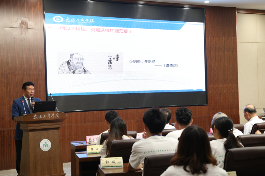 该校张安富校长作了以“武汉工商学院办学理念与学生成长”为主题的精彩演讲,全面系统地阐释了该校的育人理念。他指出,大学不仅要授业、解惑、教书育人,更要传道、立德树人。在中国现代大学,最薄弱的是以德树人。所以,引导学生修身立德,传承优秀的中华传统文化,提高学生的责任意识和自我担当意义远大。他说,“我的办学理念是,以质立校,以严立学,以诚立身,以能立业。我的育人理念是,学生为本,德育为先,学业为基,学风为要。其中,德育为先是一条非常重要的教育原则。”张安富要求,学子们做人要有大爱之心,以责任为本,以诚信立人,践行忠孝礼义廉耻“六德”,实践研读名著等“十个一”行动;要勤奋学习,乐于吃苦,善于思考,勇于突破,勤于实践;学习国学经典中立德立志、自强不息的精神,拼搏进取。