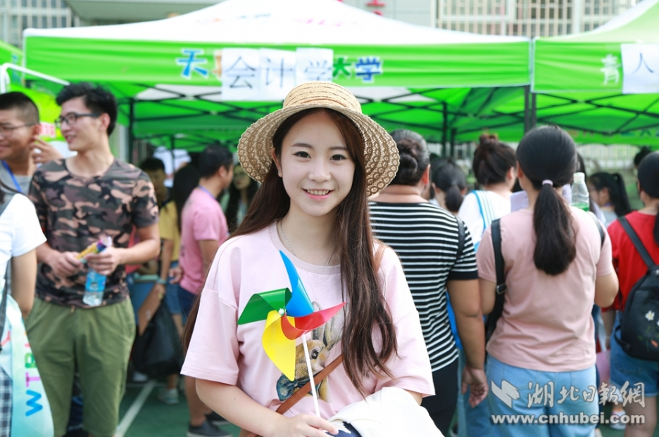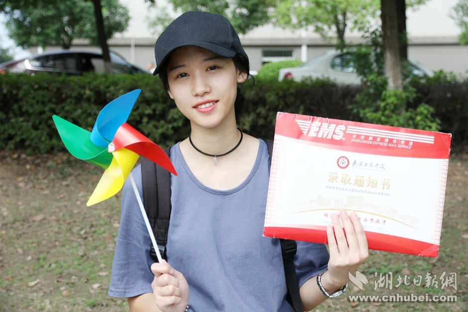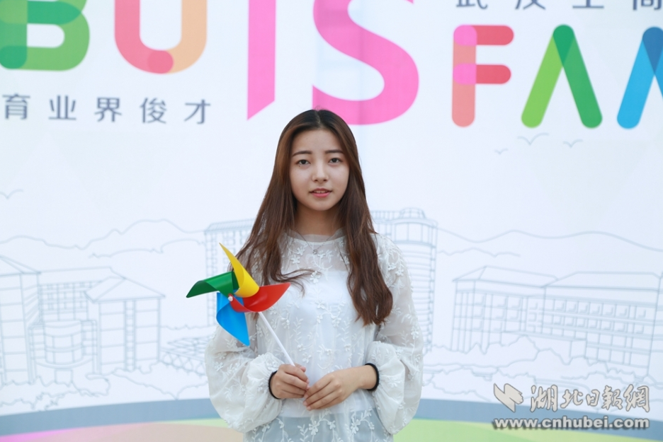 2017级新生梅媛媛与五彩风车合影。武汉工商学院特地制作了4000多个五彩风车,在开学季送给新生,希望每位新生手中有一个风车,心中有一个自己的梦想。