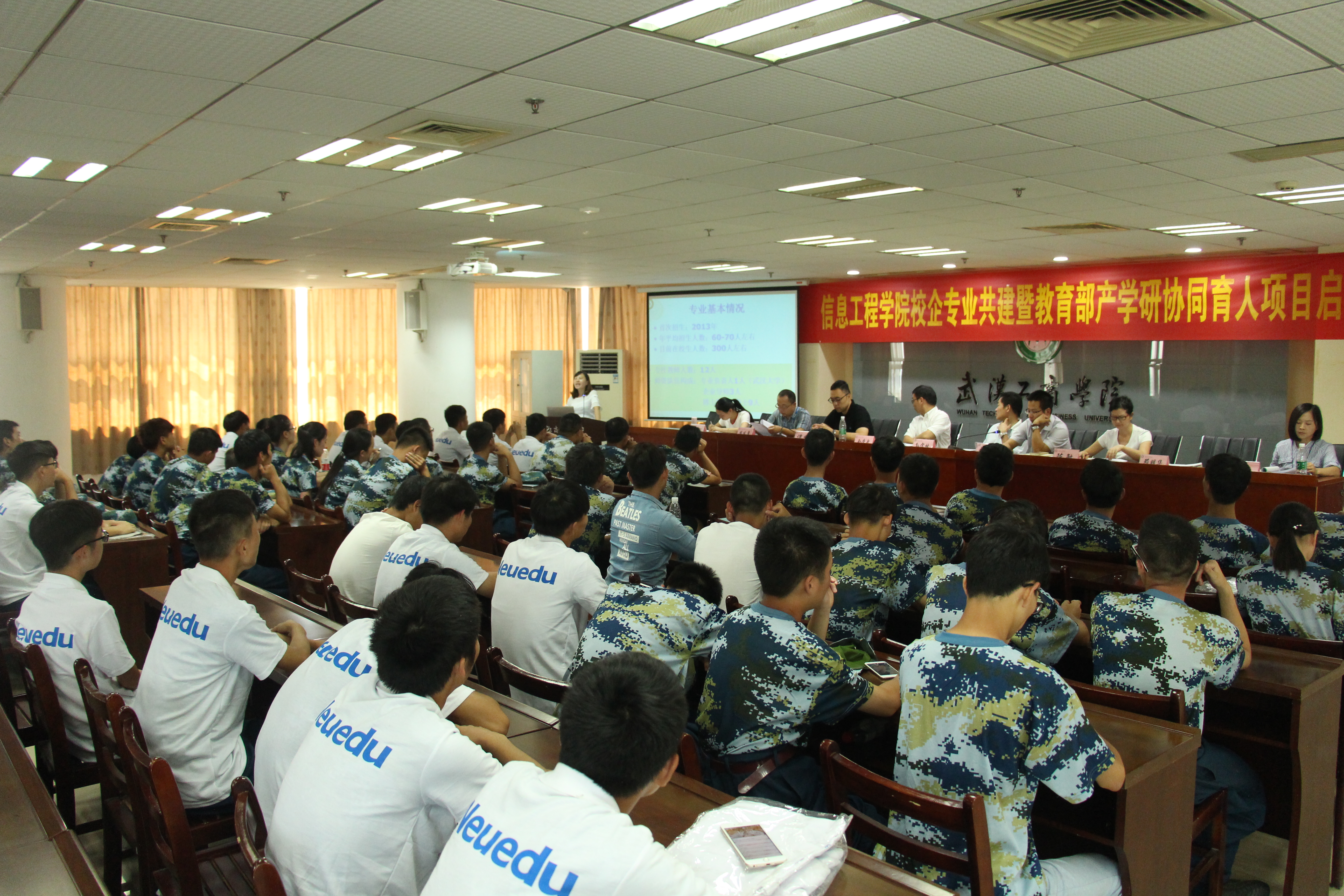 新闻中心讯(记者陈小盼)9月14日中午12:30,武汉工商学院信息工程学院在该校综合楼十楼第三会议室召开校企专业共建暨教育部产学研协同育人项目启动会。东软睿道教育信息技术有限公司总经理谭帅、华中区院校合作高级经理周凤章,该校信息工程学院院长孙宝林、常务副院长胡成松、党总支书记陈敏,教务部副部长金学武,信息工程学院电子信息工程系主任邓明华、副主任葛蓁,以及电子信息工程学院2017级所有新生参加了会议。会议由胡成松副院长主持。