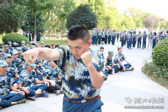 湖北日报网讯(通讯员何雨、帅波星)“军训场上来了个散打冠军,还是我们的同学!”近日,武汉工商学院学院军训训练场上,17级物流管理专业新生武明泽精湛的散打表演引起了大家的关注,直拳、勾拳、摆拳、鞭腿……系列动作一气呵成,让人惊叹!但更让大家惊喜的是这位来自吉林的18岁新生在开学报道之前,刚刚参加完2017吉林省搏击锦标赛,并斩获了85公斤级散打冠军。