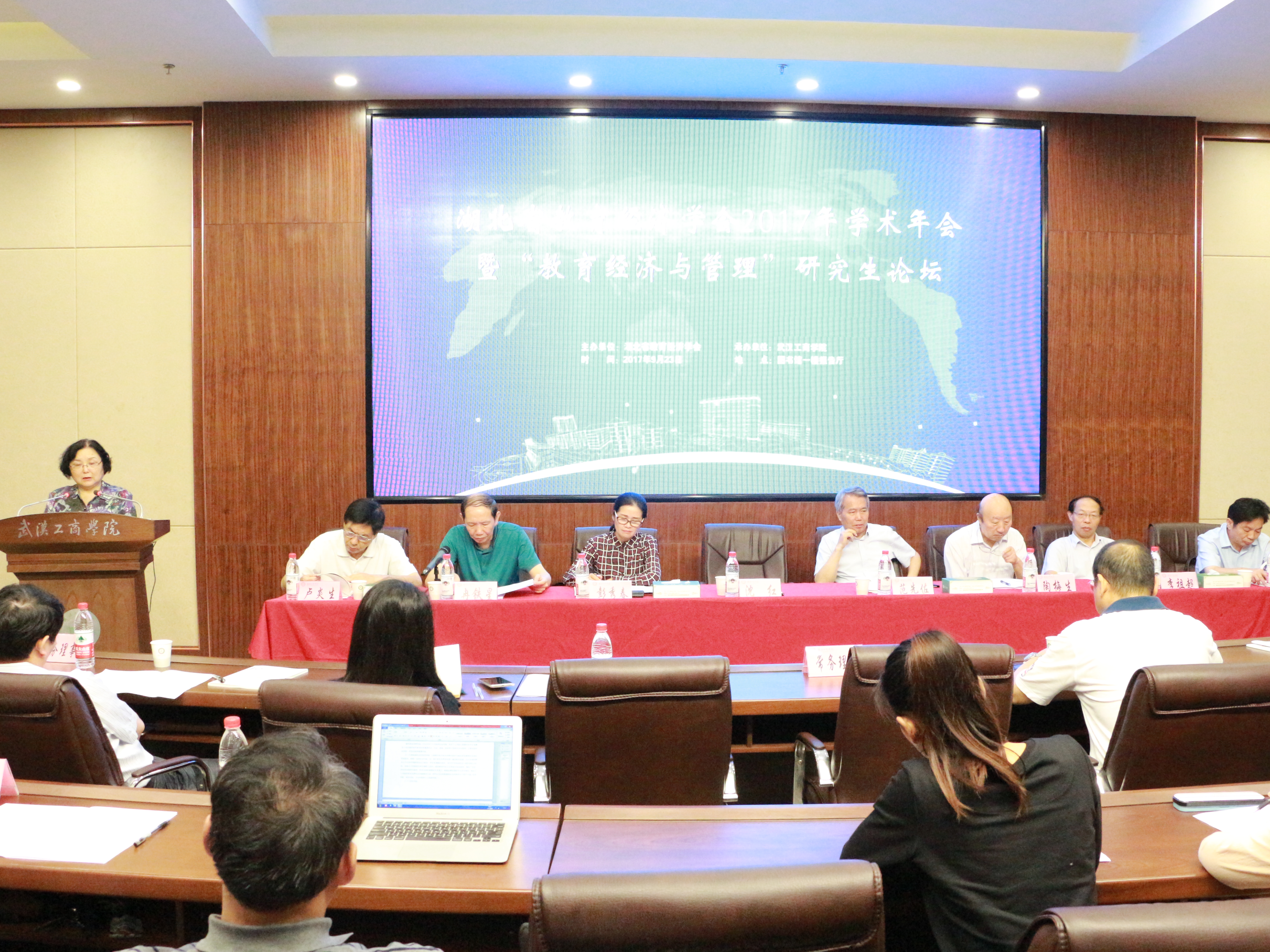 新闻中心讯(记者 陈小盼)9月23日,由湖北省教育经济学会主办,武汉工商学院承办的湖北省教育经济学会2017年学术年会暨“教育经济与管理”研究生论坛在该校召开,湖北省教育经济学会会长、华中科技大学教授沈红,学会副会长、武汉大学教授陶梅生,学会副会长、中国地质大学教授李祖超,学会副会长、黄冈师范学院校长助理汪晓凌教授,学会副会长、秘书长、省教科院研究员冉铁星,原学会副会长、华中师范大学教授范先佐,武汉工商学院董事长彭秀春、副校长卢炎生,以及学会常务理事、理事和100余名学会会员、研究生参加了会议。