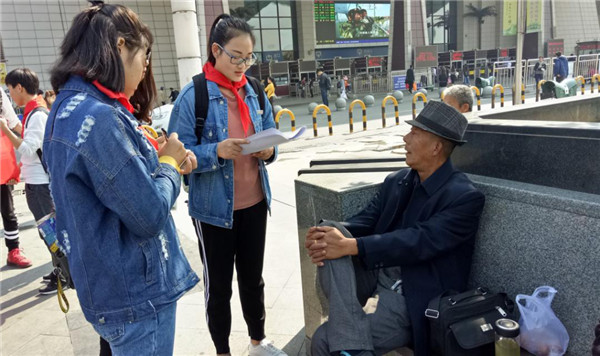 学生党员们还积极主动地与广场上的旅客交流。这其间,学生们有幸遇到了一位正在休息的高龄老党员。当问及对十八大以来中国发展的的感受时,老同志激动的告诉大家,自己生活的时代是一个幸福的时代,自己有幸见证了祖国的发展,他坚信中国会越来越来强大,人民的生活会越来越幸福。最后,老同志也不忘鼓励大家,坚定共产主义信念,继续积极地向党组织靠拢。