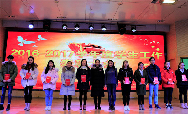 张俊宣读了《关于表彰2016-2017学年度学生先进集体和优秀个人的决定》,授予2015级会计精英实验班等11个班级“校级先进班集体”荣誉称号;授予16个班级“院级班集体”荣誉称号;授予333名学生“校级三好学生”荣誉称号,641名学生“院级三好学生”荣誉称号;授予232名学生“校级优秀学生干部”,462名学生“院级优秀学生干部”荣誉称号;授予王琬等11名学生“国家奖学金”,409名学生“一等奖学金”,429名学生“二等奖学金”,752名学生“三等奖学金”;授予453名学生“单项优秀奖”。