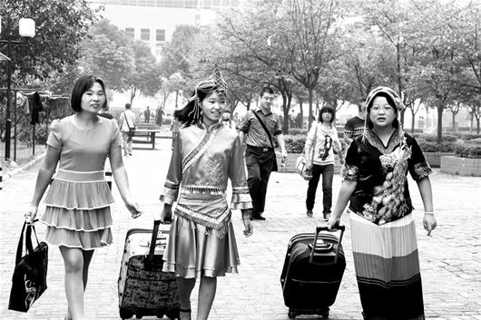 楚天金报讯 昨日,武汉长江工商学院少数民族预科班出现一道亮丽的风景。来自浙江省丽水市遂昌县一个畲族村的姑娘雷蕾(左二)和来自贵州省凯里市的彝族姑娘安雅淇(左三),特地穿着民族服装来报到,两人一见面就像亲姐妹似的拉起手聊起了家常。(记者徐伯行  通讯员蓝静、崔婷、王婷摄影报道)