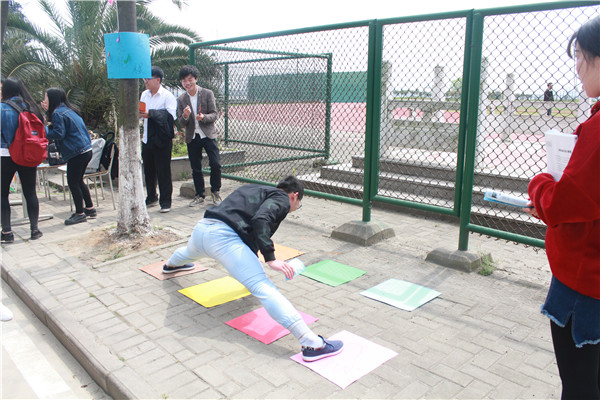 综合楼广场,活力四射的大学生们伴随着欢快的音乐跳起舞来,广场两侧的“七彩手印墙”吸引了大批的学子加入共绘七彩行列,还有闯关林小游戏集结处,限时拼图、“我爱记歌词”、丢沙袋等游戏趣味十足。