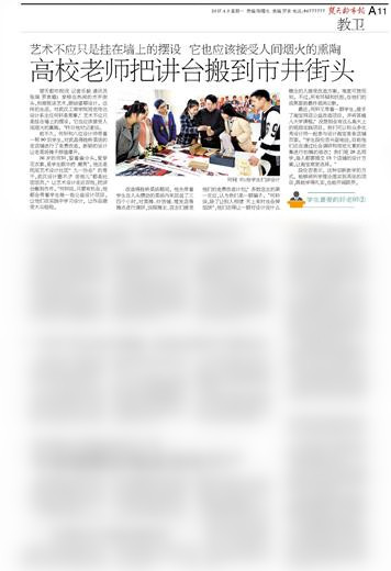 36岁的何轩,留着偏分头,爱穿花衣裳,是学生眼中的“潮男”。他还是民间艺术设计社团“九一协会”的骨干,武汉设计圈不少“老炮儿”都是社团团员。“让艺术设计走近百姓,把讲台搬到市井。”何轩说,只要有机会,他都会带着学生做一些公益设计项目,让他们在实践中学习设计,让作品接受大众检验。
