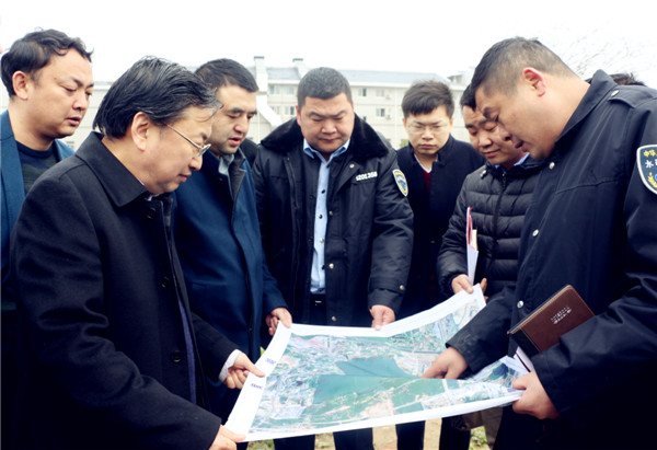 图为杨海松副区长(左一)一行正在研究黄家湖水域地图 摄影:李洋洋