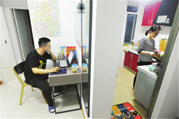 下班回到洪山魔方大学生公寓的小家后,路卓伟小两口一个负责做饭,一个继续未完成的工作 记者肖僖摄