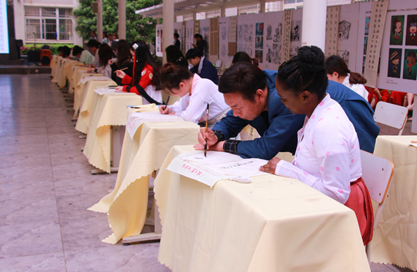 图为陈伟书记指导外教写毛笔字 摄影:向慧