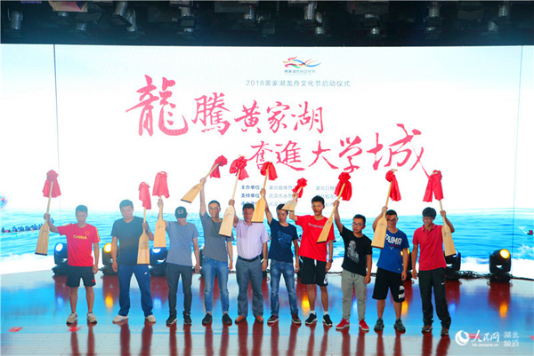 人民网武汉5月25日电 飞龙腾跃,风云际会舞壮志。千舟竞发,青春激荡绘彩虹。24日下午,“龙腾黄家湖 奋进大学城”2018黄家湖龙舟文化节正式启动,标志着湖北省龙舟文化再添新的名片。龙舟文化节6月10日在黄家湖畔开幕。届时,10支来自全省的高校龙舟队将竞渡黄家湖。