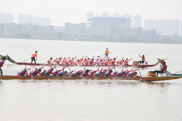 来自华中科技大学、华中科技大学同济医学院、湖北中医药大学、武汉科技大学、江汉大学、三峡大学、长江大学、湖北商贸学院、武汉商学院、武汉工商学院的10支高校龙舟队的体育健儿们沿着200米赛道奋勇前行。