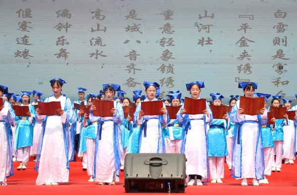100名身着古装、捧竹简的大学生,现场诵读《黄家湖赋》和《楚辞·九章·涉江》。书声琅琅中,黄家湖千年人文气韵如画轴般渐次展开。其中《黄家湖赋》由武汉工商学院管理学院党总支书记张兆学创作。