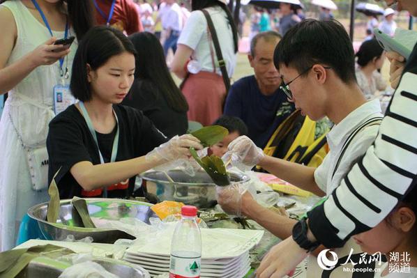 除了龙舟竞渡,本届龙舟文化节还设有“颂养天地”“尊礼崇德”“乐民之乐”几大主题单元,包含舞龙舞狮、中华经典与《黄家湖赋》诵读、楚风舞韵、旱地龙舟友谊赛等活动。活动现场还设置了制作传统粽子展台,吸引不少学生、市民参与体验。武汉工商学院学生叶诗雨是第一次包粽子,她介绍,包粽子的粽叶要用夏天的伏叶,米要用圆头糯米,10余道工序全靠手工完成。