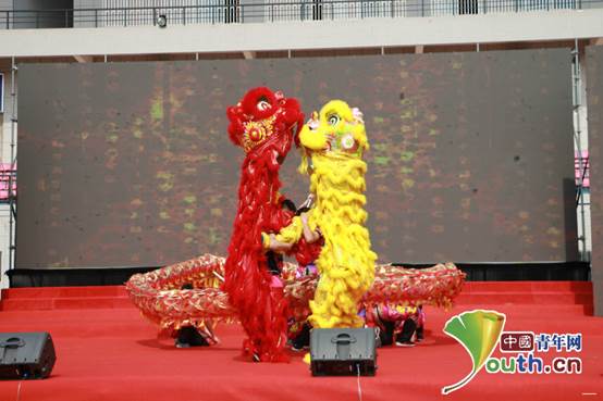 开幕式现场,武汉工商学院精英龙狮社的大学生们用一段火热的舞龙舞狮表演,拉开了文化节的序幕。