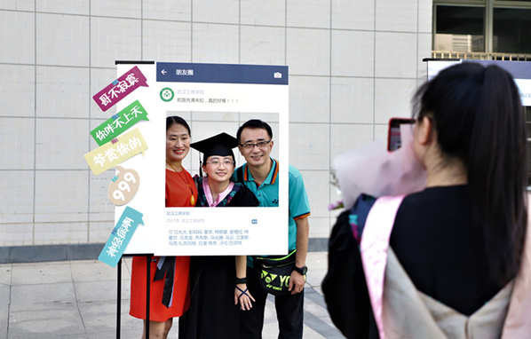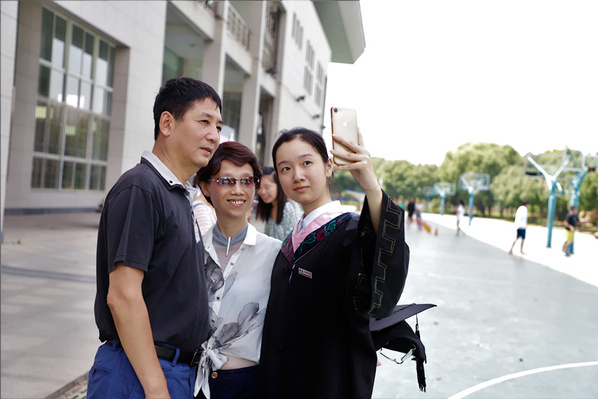 图为毕业生正在与父母自拍