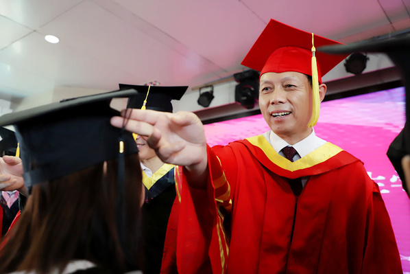 图为张安富校长为毕业生拨穗
