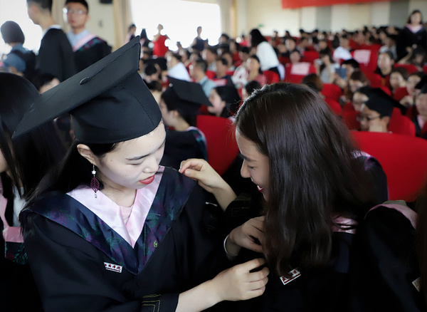 图为即将毕业的同学互相整理学士服