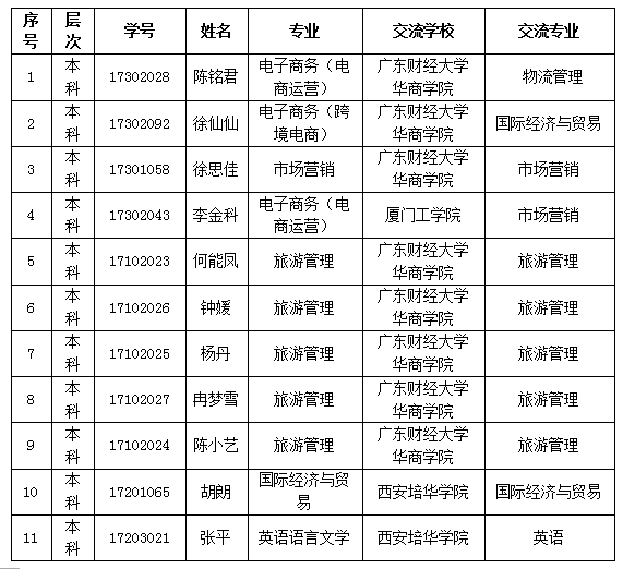 根据武汉工商学院教务部[2018]047号《关于开展2018-2019学年第一学期国内高校交流学习项目报名工作的通知》文件要求,经过个人申请,二级学院推荐,学工部、教务部审核,已拟定参与本次交流学习项目的学生名单,现予以公示,公示期为2018年7月5日至7月9日。