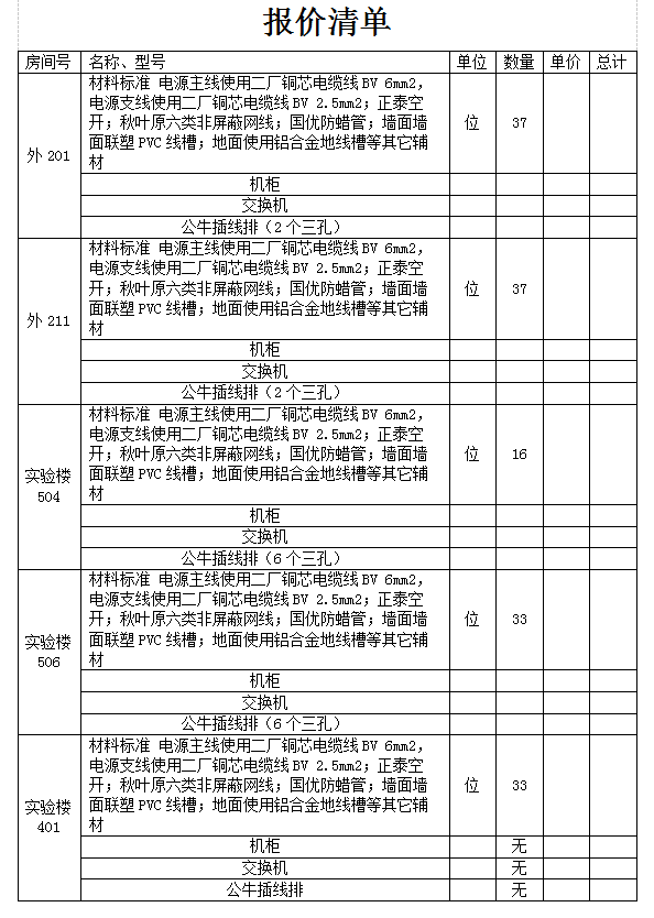 1、实验分中心网络改造工程目标任务是完成实验中心504房间16个点位、506房间33个点位、401房间33个点位;外语楼210房间37点位、211房间37点位的网络综合布线工程。