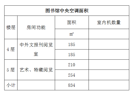 此方案设计及施工范围为体育馆教室区域中央空调使用面积370平方左右;图书馆面积见下表