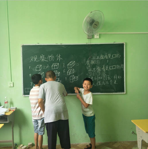 《精卫填海》、《夸父逐日》、《龟兔赛跑》等与课文内容相关的小故事,正方体、等腰梯形等折纸模型成为了每天孩子们语文课和数学课上的期盼。为了让这半个月的语文课和数学课更有意思,志愿者们充分调动每位小朋友的积极性并提高他们的想象力及动手能力,志愿者们在前一天的晚上都会认真备课,以达到自己课堂的预期效果。在志愿者们的精心准备下,课堂氛围非常活跃,小朋友们积极举手回答问题,勇敢走上讲台背诵默写。看着孩子们积极认真的脸庞,志愿者们十分欣慰。