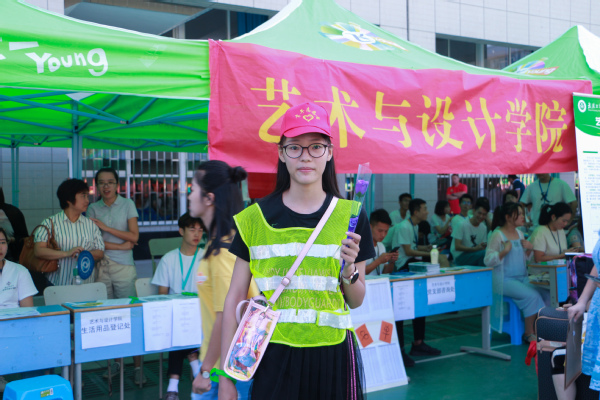 图为志愿者正在指引新生报到 摄影:唐明悦