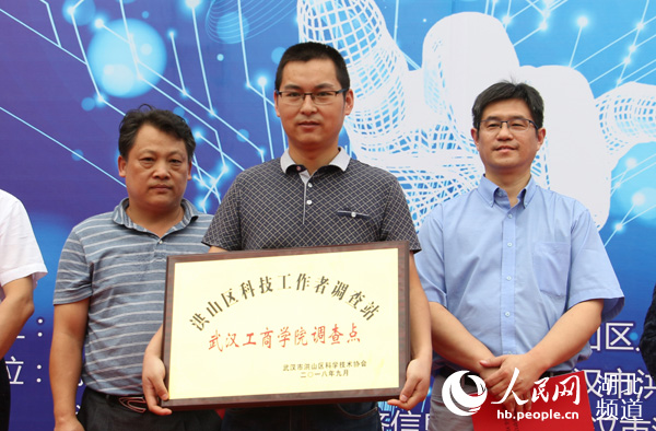 图为武汉工商学院获洪山区科技工作者调查站授牌(葛诗瑶 摄)