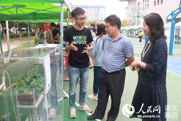 武汉工商学院学生范康俊正在向洪山区政府副区长王在桥(中)介绍甲醛处理项目(郭冰雪 摄)