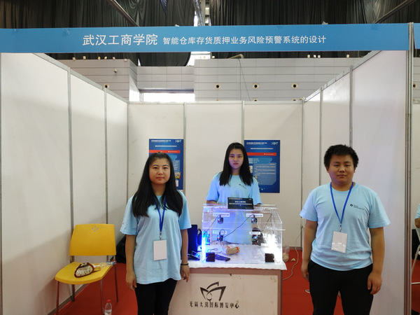 武汉工商学院参赛团队由王巍、王勇两位指导老师带队,学生刘威、曹婷、钟玲3人组队参赛,团队以银行等具有放贷能力的金融机构为服务对象,设计了一套农产品智能仓库存货质押业务金融风险预警系统,实现了放贷风险指标数据的实时采集、远程存储、以及最终风险系数的计算。该作品不仅在总决赛中表现出色,而且还受到2018世界物联网博览会参会人员广泛关注,许多参会厂商前来咨询该作品的设计创意和系统实现。