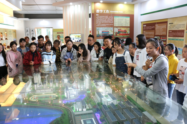 图为讲解员董佳宜为新生介绍学校建筑沙盘