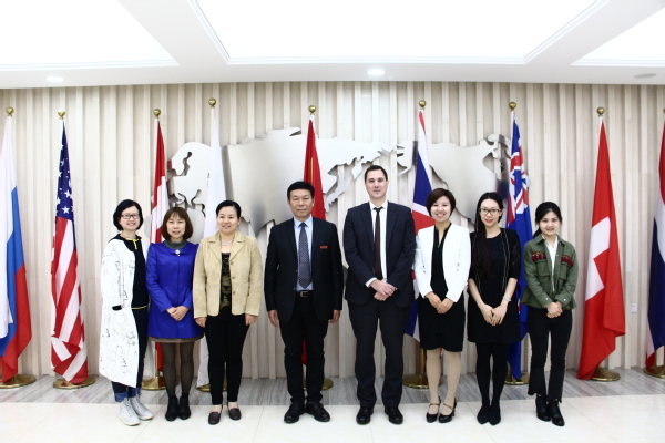 新闻中心讯(见习记者 杨盛 顾晴阳 柯念慈 周豪)10月16日上午9:30,英国北安普顿大学市场与国际事务部主任马修·海恩斯,中国代表处招生代表吴倩琳来武汉工商学院考察交流。学校党委书记陈伟,国际合作交流处处长孔少敏,经济与商务外语学院常务副院长张晓骏,文法学院党总支书记陈敏等在国际会议厅热情接待了来访嘉宾。会议由孔少敏处长主持。