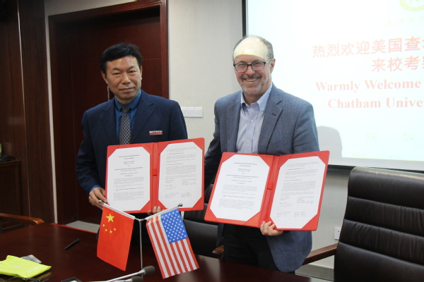 David Finegold校长向参会嘉宾介绍了美国查塔姆大学的办学情况与特色。“查塔姆大学生师比较高,采用小班教学制,师生交流非常密切。学校现有健康科学学院、文理和商业学院、可持续发展学院,地理位置优越,办学质量高,生活成本低。”他特别介绍道,查塔姆大学的校区建设是依据可持续发展理念建设的节能环保型校区,整个校区实现零碳排放,各类资源实现循环利用,是全美示范性可持续校园。这一建设成果与武汉工商学院环境与生物学院与企业合作开展的相关领域研究的目标及理念一致。