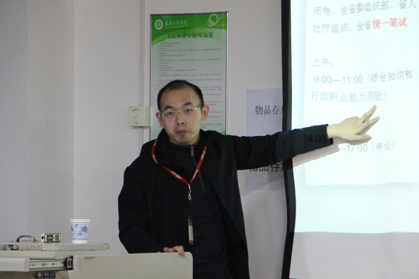 新闻中心讯(记者 谢艳 见习记者 许少云 杜淑霞 张海霞)2019年选调生考试即将于2019年初开始,为了让2019届毕业生提前了解选调生政策,为考试做好准备,11月8日晚7:00,由武汉工商学院就业指导中心主办的“就业活动季”之湖北省选调生考试备考讲座在学校综合楼205举行,讲座特邀中公教育湖北考试研究院行测部杨昌墨老师担任主讲。