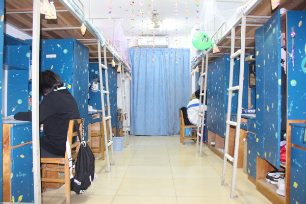周成介绍,寝室一共住了5个人,虽然认识时间不长,但志趣相投,感情也很好。为了打造一个温馨、有品味的家,同时也响应环生学院打造环保、创意寝室的号召,国庆假后,大家就商量着如何利用废旧物品把寝室装饰一下。由于大家都比较喜欢休闲自然的风格,寝室的布置就主要是以舒适为主。大家一起把平时喝水后收集起来的矿泉水瓶做成小灯罩,用瓶盖拼成寝室号码,然后还购买了吊椅、墙纸、软垫等,在大家的精心布置下,寝室又美丽又温馨。