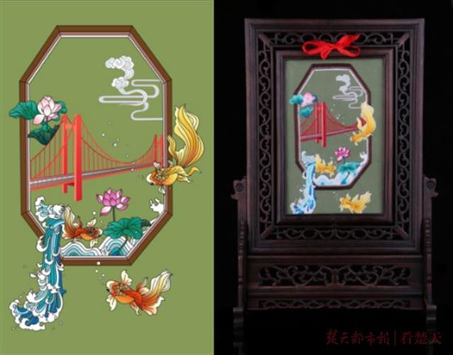 非遗汉绣团队目前已开发出十个主题共100款原创汉绣装饰图案样稿,该项目内部分原画作品已经在第二届长江非物质文化遗产大展上展出。数款该项目内图案应用的文创产品也即将面世。这些汉绣作品简洁、美观且具有强烈的楚文化特点,具有审美和文化传承等多重价值。例如其中的一件作品《流连鹦鹉洲屏风》,按瀑布左前、鹦鹉洲大桥主体居中、装饰云纹右后布局,分近景中景远景,画面具空间感,延伸性。分布均衡、和谐、美观。据团队指导老师程奇老师介绍,这款《流连鹦鹉洲屏风》图案元素包含由武汉新文化标志性建筑鹦鹉洲大桥与装饰性水浪、云纹、荷花、荷叶、灵动的金鱼融合在一起,自然和谐。