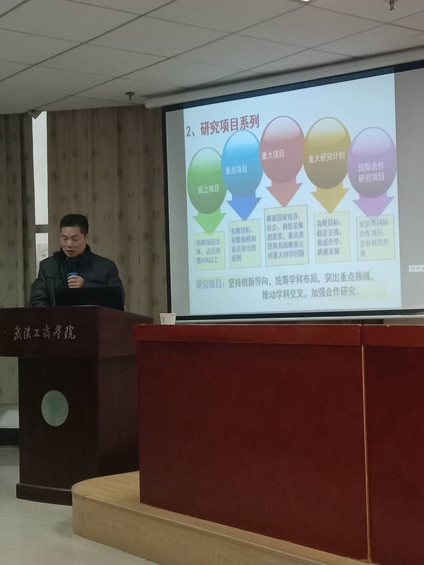 新闻中心讯(特约记者 曾荷爱)12月7日下午15:00,由武汉工商学院科技部组织的国家自然科学基金项目申报专题辅导讲座在第三会议室举行,武汉科技大学陈涛教授和武汉工商学院信息工程学院孙宝林教授分别做有关国家自然科学基金项目申报的专题辅导,学校近40名教师听取了讲座。